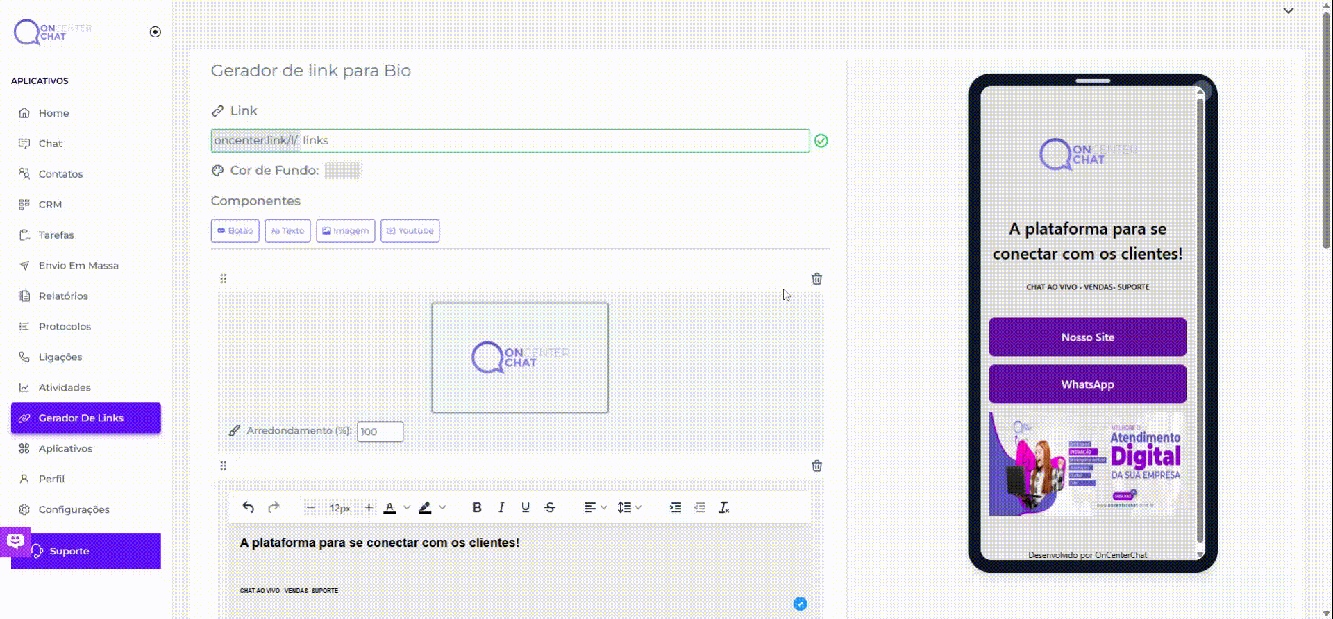 Com o Gerador de Link para Bio da Oncenter Chat, você cria páginas personalizadas com seus canais, produtos, serviços e botões diretos para conversa — tudo em poucos cliques.
