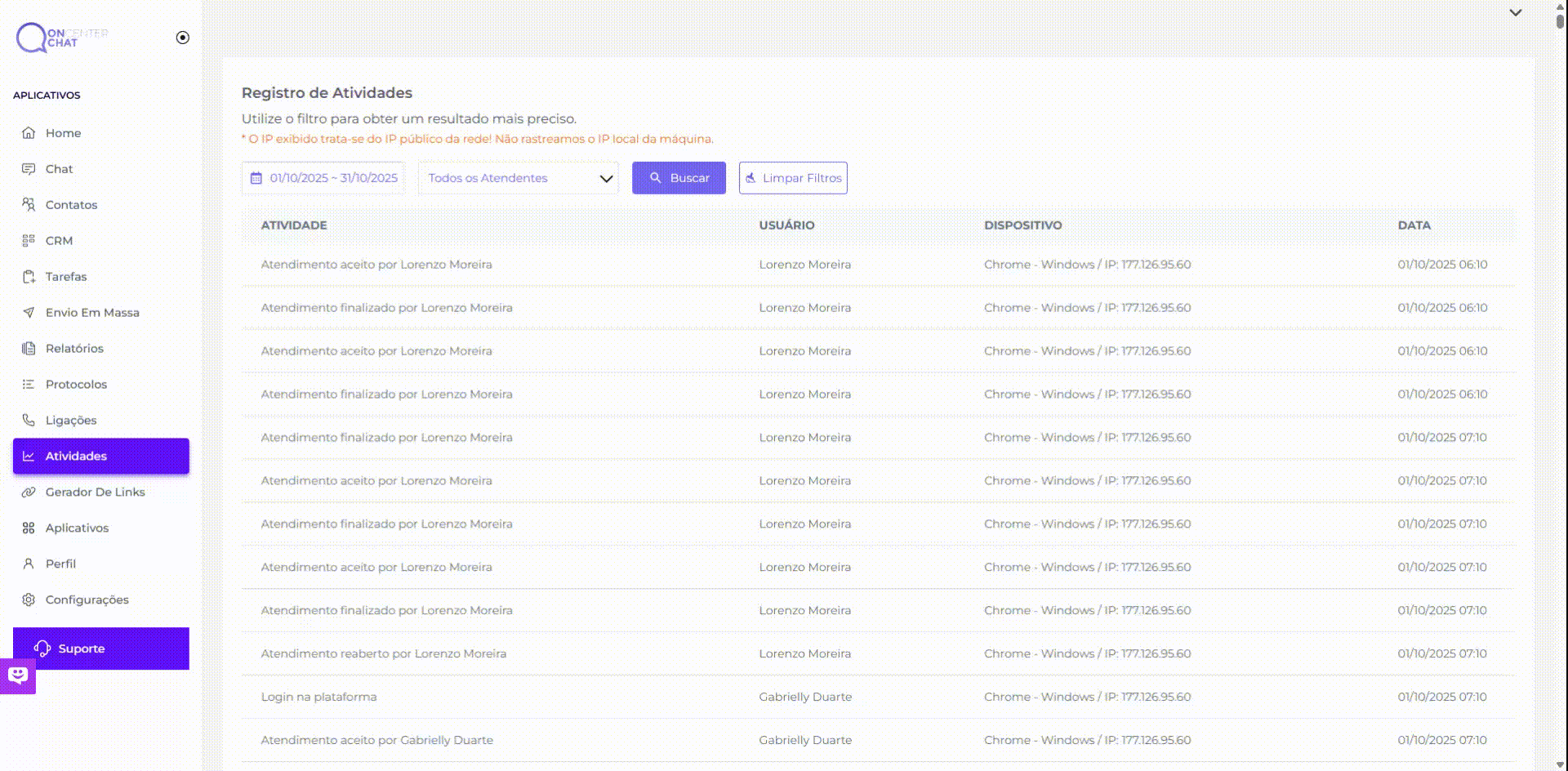 O Registro de Atividades da Oncenter Chat monitora em tempo real tudo o que acontece: logins, atendimentos, transferências, alterações, criações e exclusões.