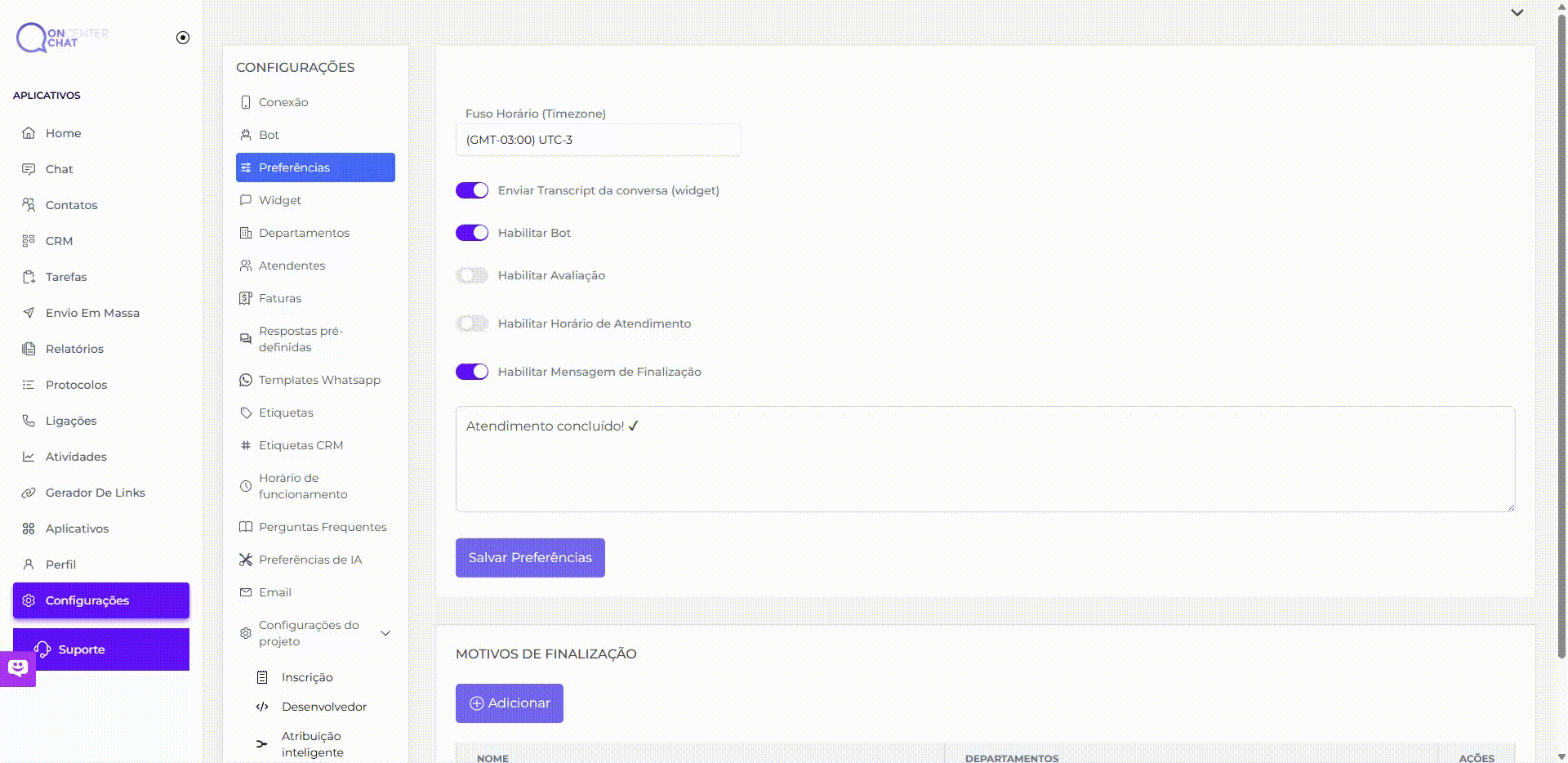 Cadastre motivos de finalização, defina mensagens automáticas de encerramento, configure horários de atendimento e habilite a avaliação do cliente para medir a satisfação em tempo real.